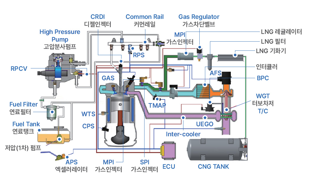디젤-천연가스 혼소시스템은 기존 디젤 엔진에 가스 공급 시스템을 추가함으로써 주 연료는 천연가스를 사용하고 디젤연료는 천연가스 혼합기의 점화원으로써 소량 분사하여 운전하는 방식입니다.