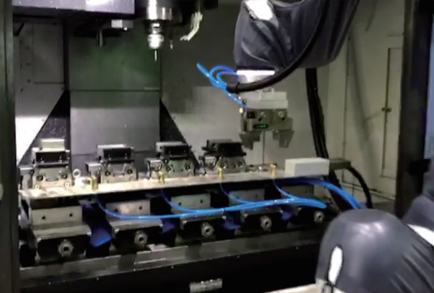 • 공급 Feeder소재 투입 ▶ 정면,측면 MCT 가공 ▶ 제품 취출 후 배면 안착 ▶ 후면 MCT 가공 ▶ 치수 검사 ▶ 적재 Feeder 이송